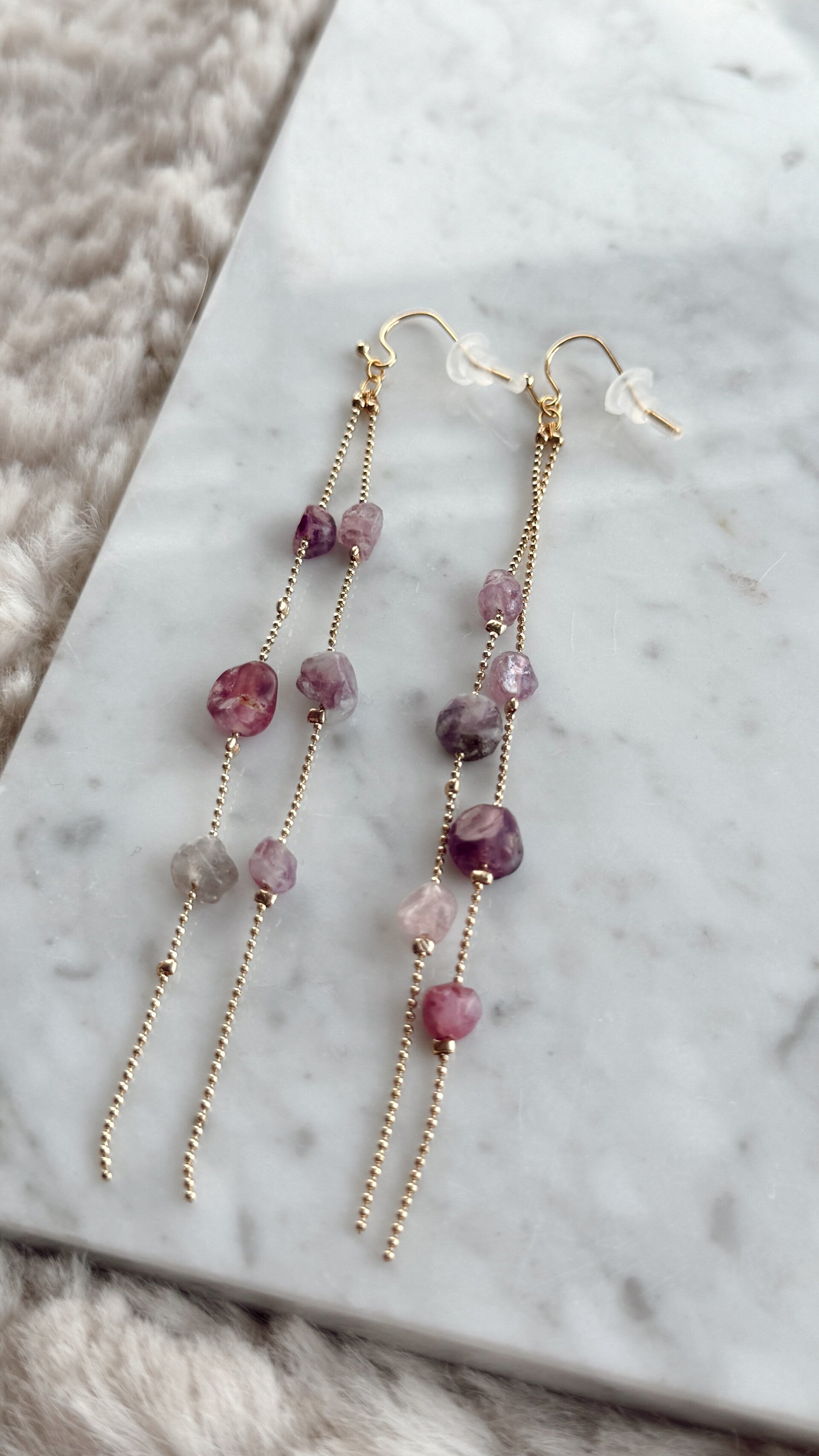De oorbellen zijn er in een gouden en deels zilveren variant. Ik kon de bedels niet in volledig zilver krijgen, zie de foto's! Ook zijn de steentjes van natuurlijk materiaal wat maakt dat alle oorbellen stuk voor stuk uniek zijn en kunnen afwijken van de foto's